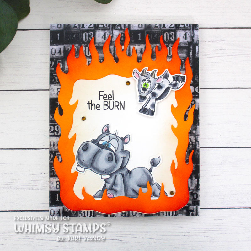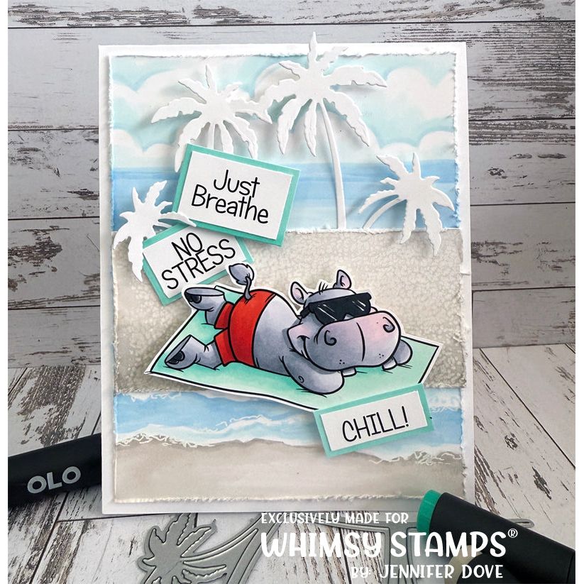 Whimsy Stamps Hippo Yoga Clear Stamps is a 4x6 inch set illustrated by Dustin Pike. It features two hippos, one practicing yoga and the other lounging on a mat with sunglasses—along with a playful goat and fun coordinating sentiments.