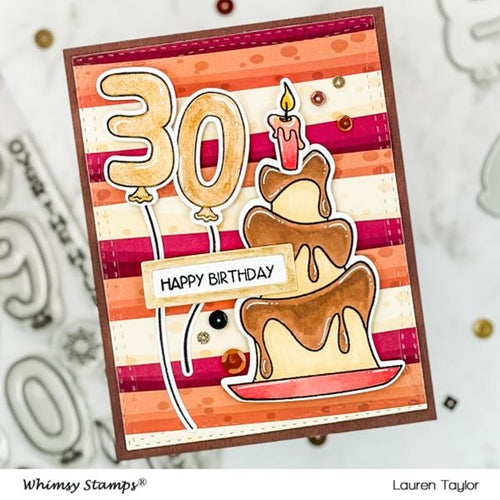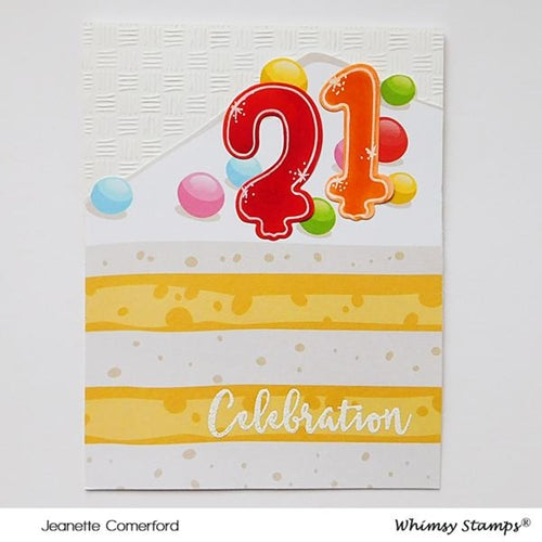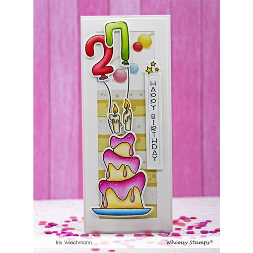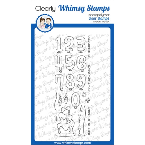 Clearly Whimsy Stamps Collection Make a Wish designed by Deb Davis Amped2Stamp for Whimsy Stamps. These new larger clear stamp sets give more stamps per set for additional mix and match options. This set of balloon shaped numbers and a cake are perfect for birthday cards, scrapbook pages, and more. Coordinates with the Make a Wish Outline Die set, sold separately.