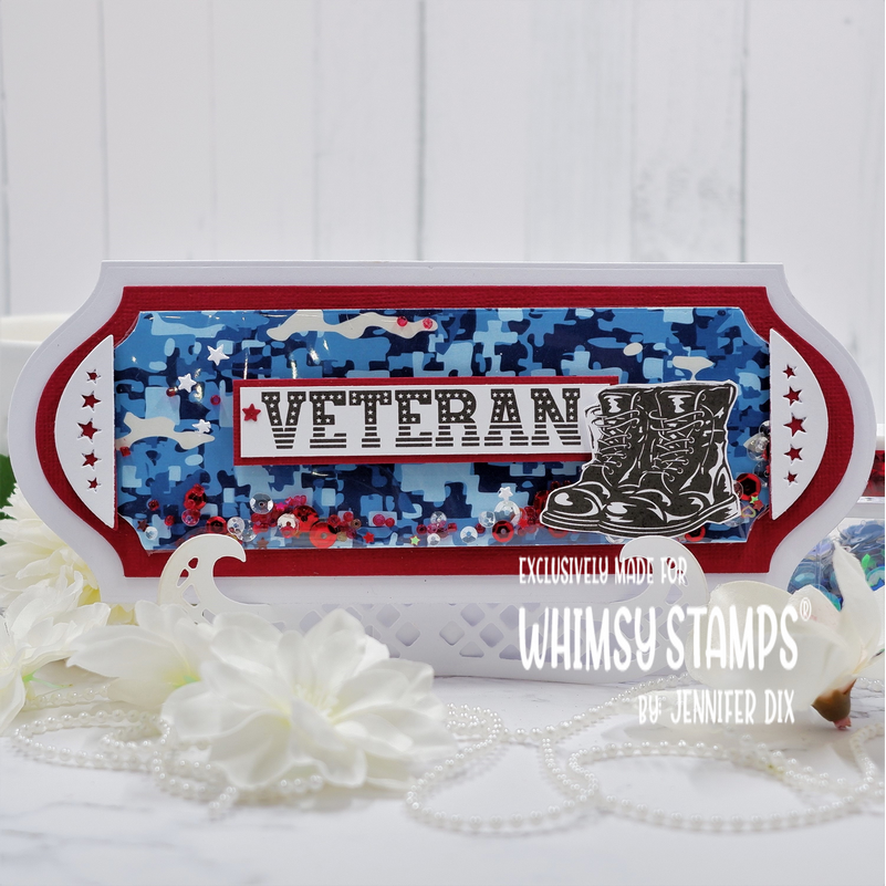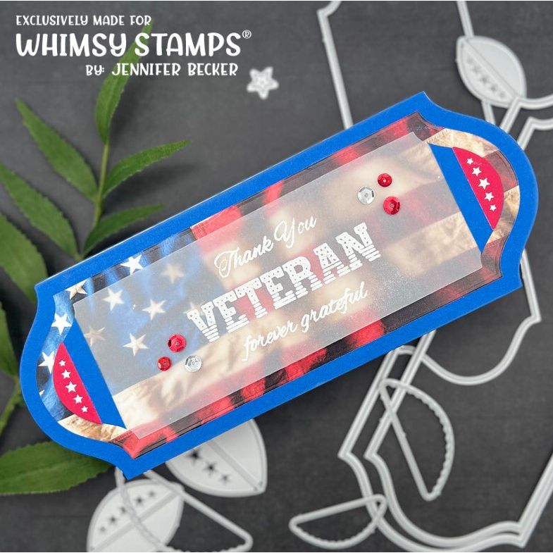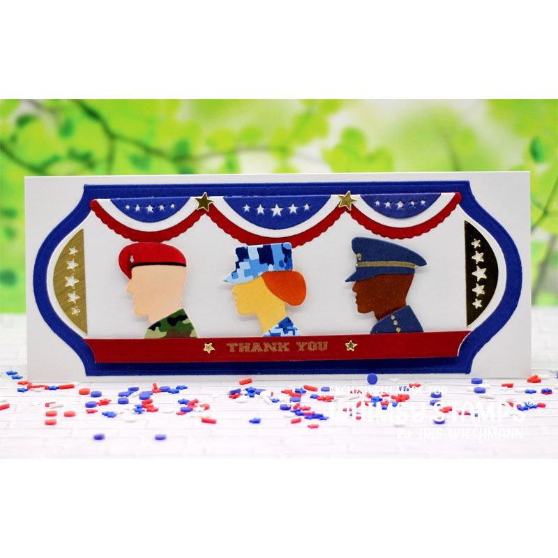 The Military Bunting Die Set from the Whimsy Stamps Die Collection has been designed by Deb Davis exclusively for Whimsy Stamps. This set includes 10 dies that can be used to create various combinations of military (or other) accents for paper craft projects that honor our military heroes and sheroes. These dies coordinate with Whimsy Stamps Military collection of products.