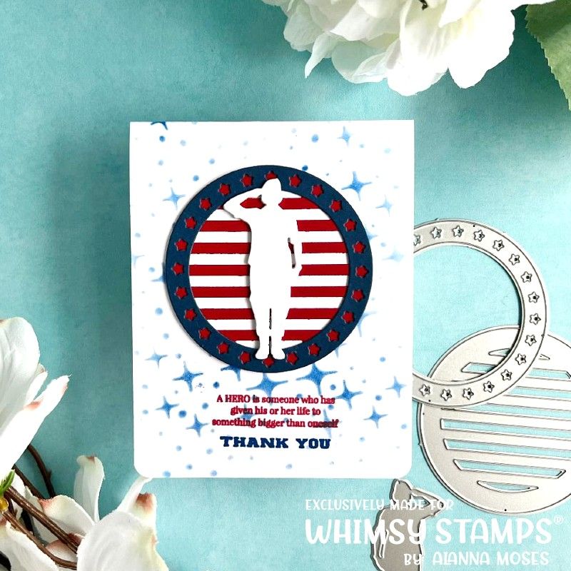 With this die set, you can create various combinations of military accents for paper craft projects honoring our military sheroes and heroes. The set includes a large solid circle, a small solid circle, a striped circle, a star frame circle, and two additional accent dies.