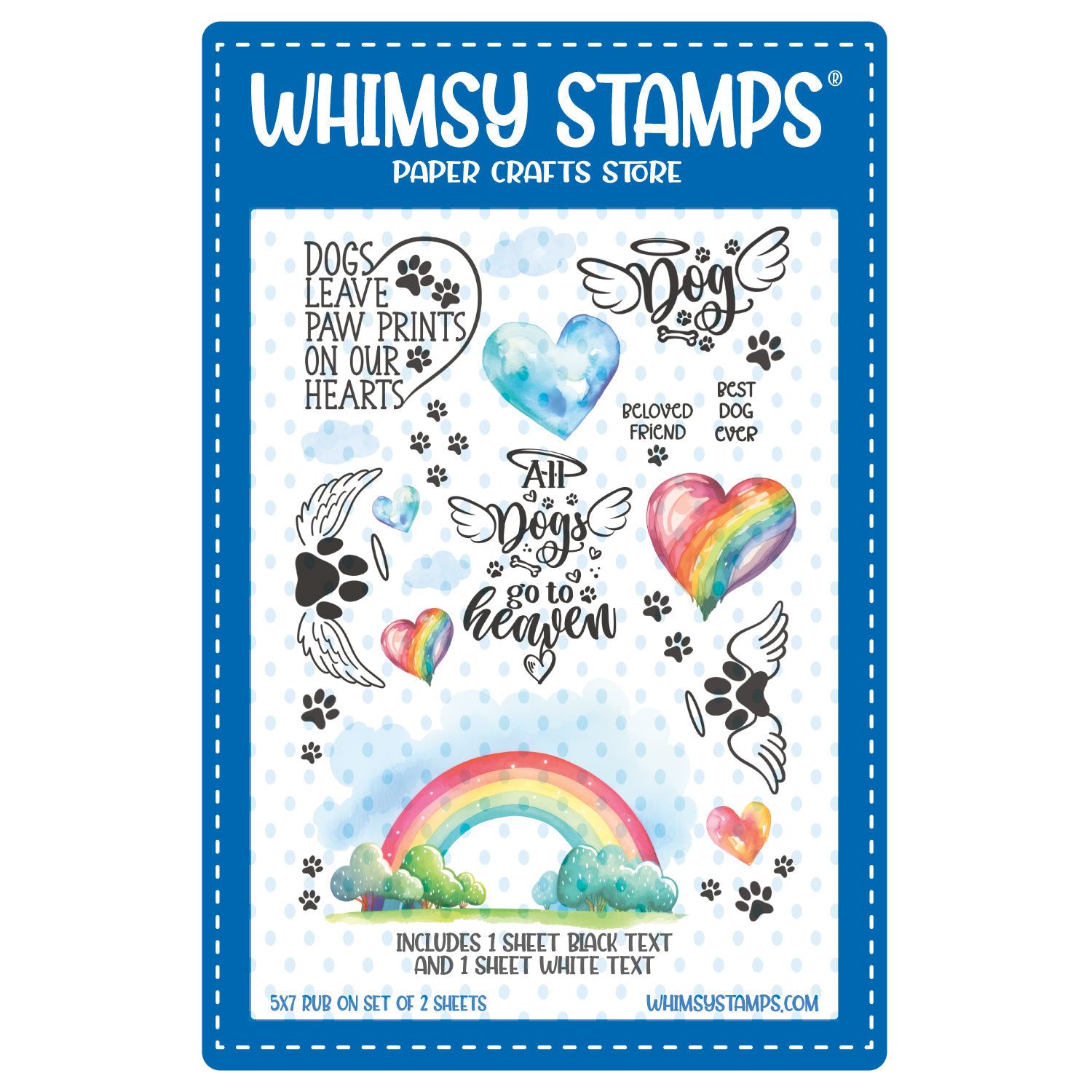 The Whimsy Stamps Rainbow Bridge Dog Rub Ons provide a beautiful and convenient way to create meaningful designs for your projects. This set includes two 5x7 inch sheets of image transfers: one with black text and full-color images and the other with white text and full-color images. The designs feature rainbows, hearts, paw prints, sentiments, and angel wings, making them ideal for honoring a beloved canine companion.