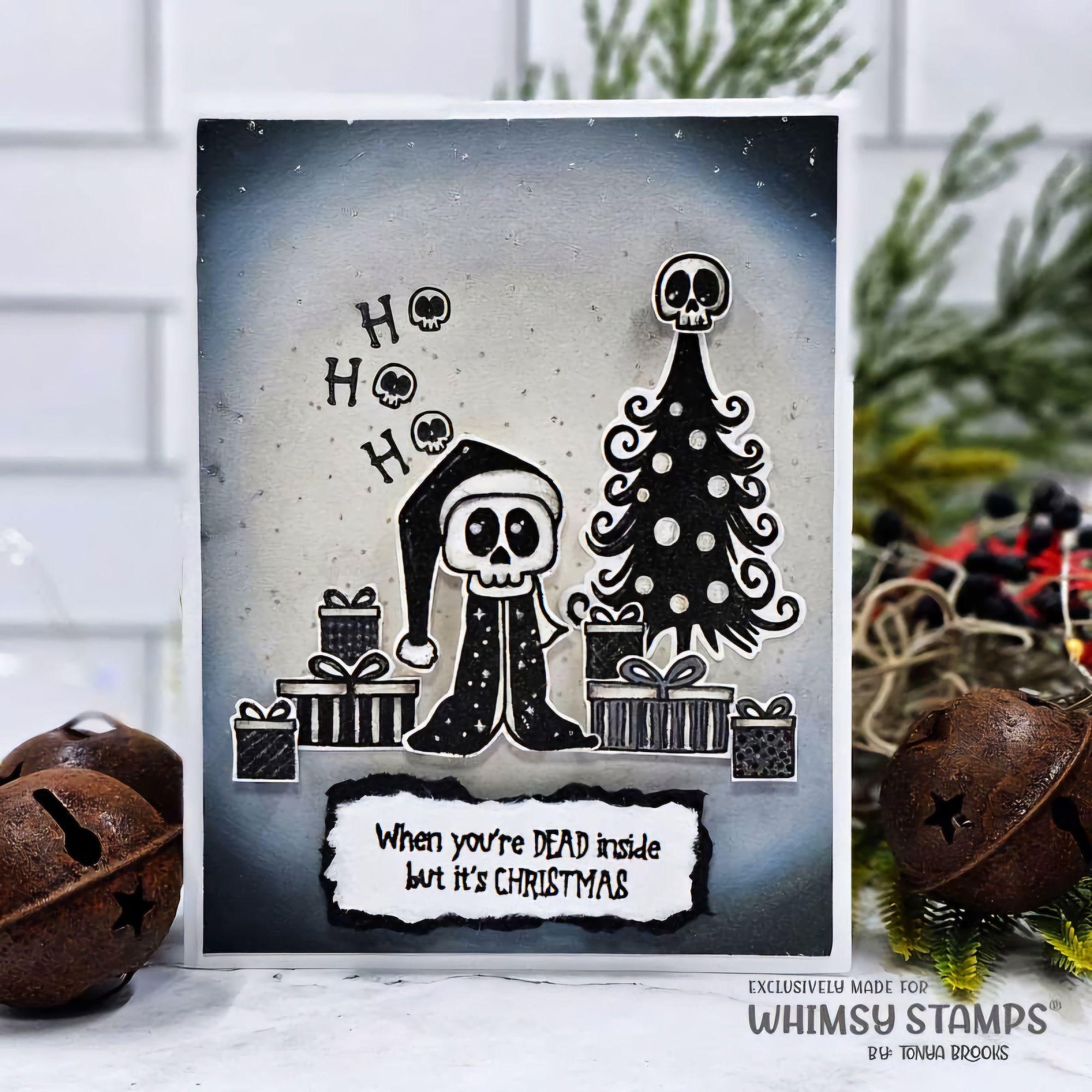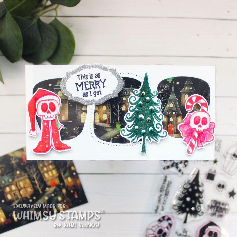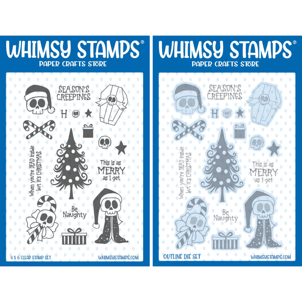 The Whimsy Stamps Season's Creepings Clear Stamp and Outline Dies Set is perfect for creating unique holiday cards with a blend of Halloween and Christmas themes. This set includes a clear stamp collection featuring 5 main images, 6 smaller accent images, and coordinating snarky non-Christmas sentiments. Additionally, it comes with 13 outline dies that perfectly cut out the stamped images.