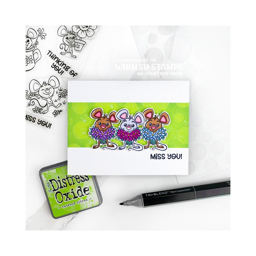 The Spring Gardening Mice stamp set is part of the Clearly Whimsy Stamps Collection and features delightful illustrations and sentiments designed by Krista Heij-Barber for Whimsy Stamps. These high-quality photopolymer clear stamps are perfect for adding charming and whimsical designs to your paper crafts.