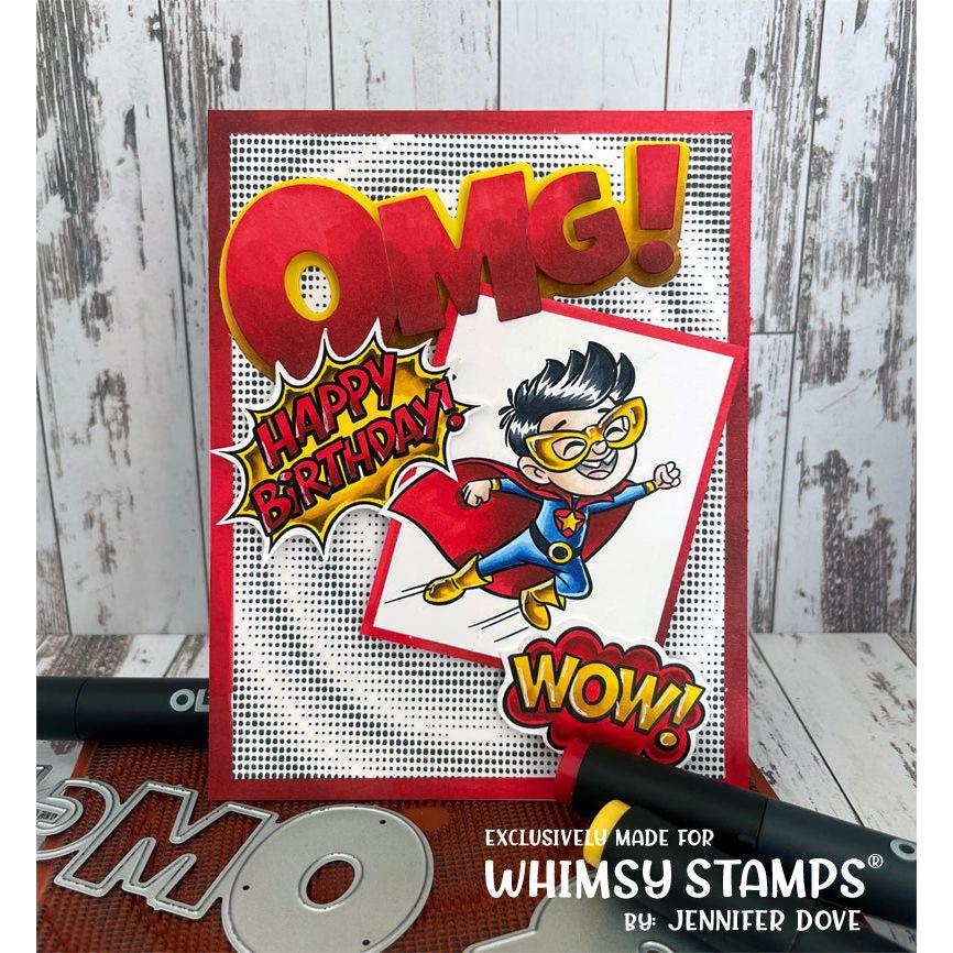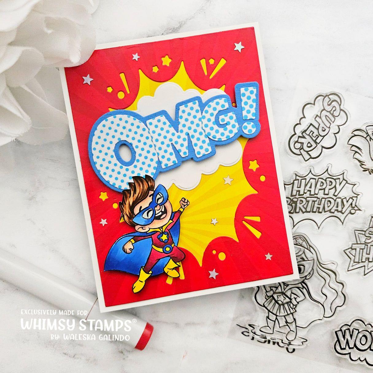 The clear stamp set features images and sentiments of two kids dressed as superheroes, along with classic comic book style fonts for the sentiments. Crafted from high-quality photopolymer, these clear stamps provide crisp and detailed impressions when used with an acrylic block.