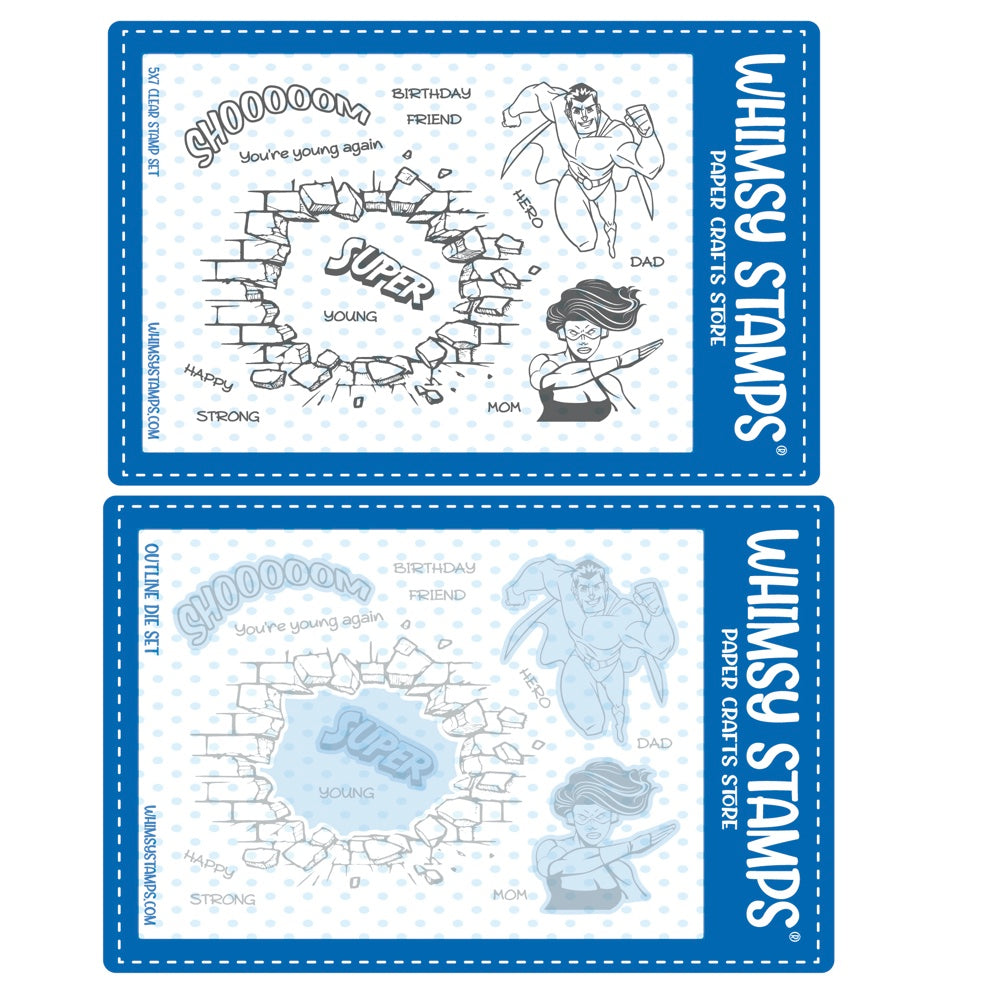 Whimsy Stamps Super Young Clear Stamp and Die Set includes the 5x7 inch Super Young Clear Stamps CSWD290a and coordinating Super Young Outline Dies WSD014.