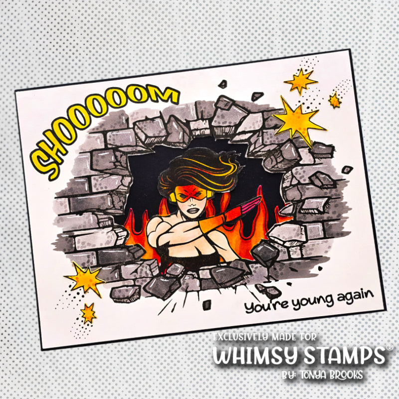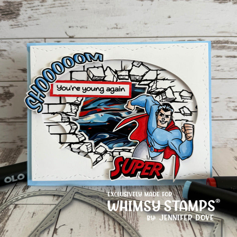 Whimsy Stamps Super Young Clear Stamps is a 5x7 inch clear stamp set filled with comic book style fun, perfect for sending SUPER greetings!