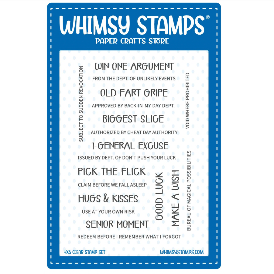 Whimsy Stamps Ticket Coupons Sentiments Clear Stamps is a 4 x 6 inch set filled with a variety of humorous sentiments designed to pair with the Ticket Coupons Elements, sold separately, for creating one-of-a-kind ticket-style coupons.