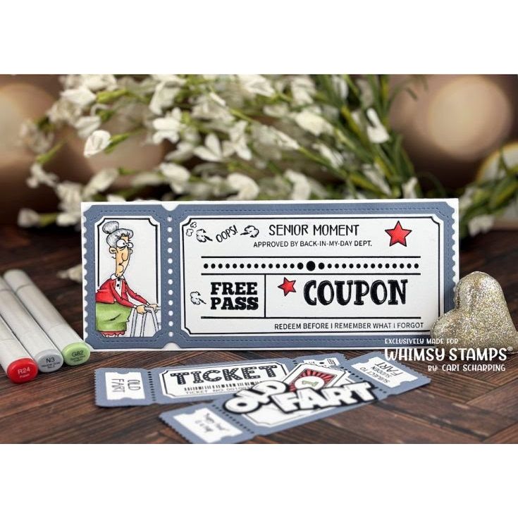 Use these birthday, anniversary, old fart, and everyday sentiments on their own or mix and match them with other elements from the Whimsy Stamps Terrific Tickets Collection, sold seperately, for playful, personalized projects.