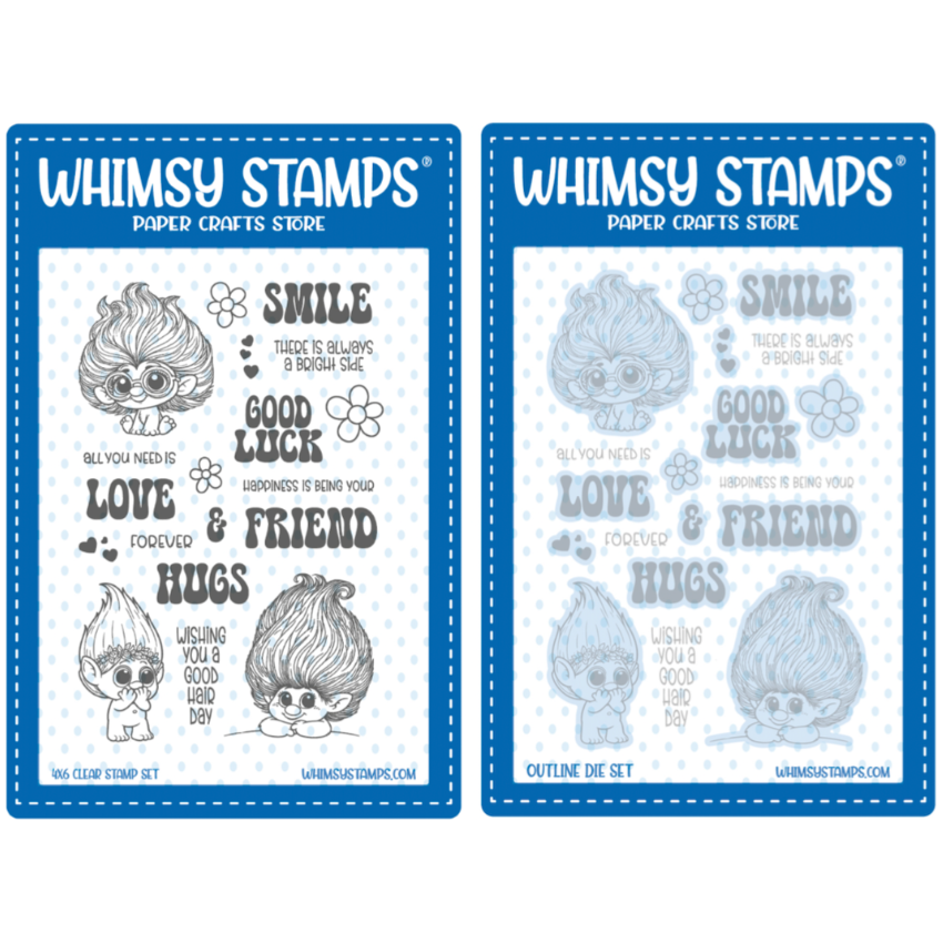 The Whimsy Stamps Troll Friends Clear Stamp and Die Set is a delightful combination, perfect for creating fun and whimsical crafting projects. This set includes the Troll Friends Clear Stamps CWSD267a 4x6 inch clear stamp set featuring big-haired trolls, along with 3 large troll images, 5 small accent images, 5 large sentiments, and 5 small sentiments to add personality and charm to your designs.