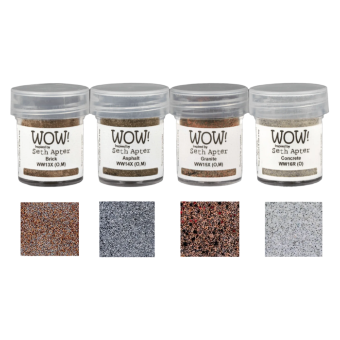 The inspiration behind the Building Blocks Quad is twofold. First off, all four powders capture the surface of traditional building materials: Brick, Asphalt, Granite, and Concrete. The surfaces are rough and imperfect - perfect for mixed media. Secondly, these four powders provide the user with the 'building blocks' to enable them to create and build their artistic vision.